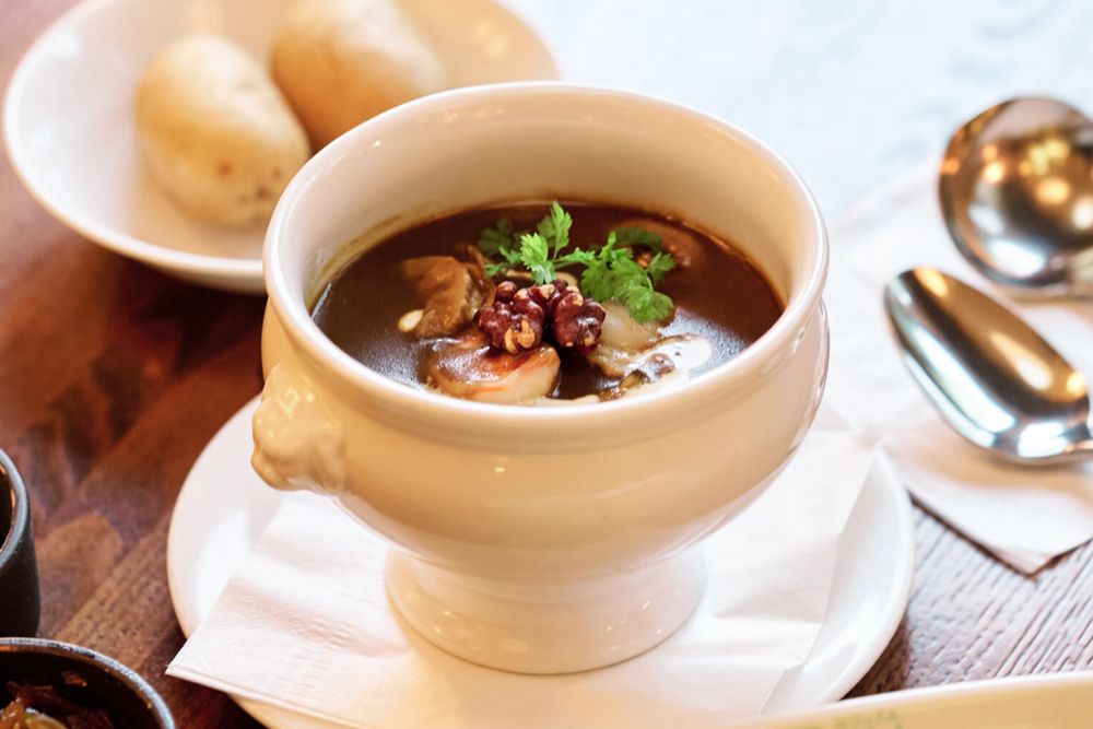 大量の玉ねぎを時間をかけて煮込み、ショウガやにんじん・セロリといった野菜をバターで12時間炒めたペーストが、味の土台を支えている。